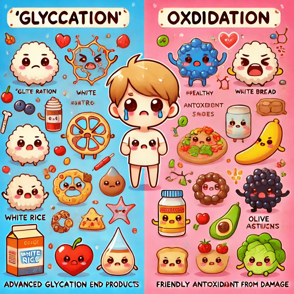 私たちの体内で起こる「糖化」と「酸化」は、老化を早める二大要因といえ、糖化とは余分な糖とタンパク質が結びついて体の中で“コゲ”のような物質をつくる現象で、AGEs(最終糖化産物)と呼ばれる老化物質が蓄積していきます。