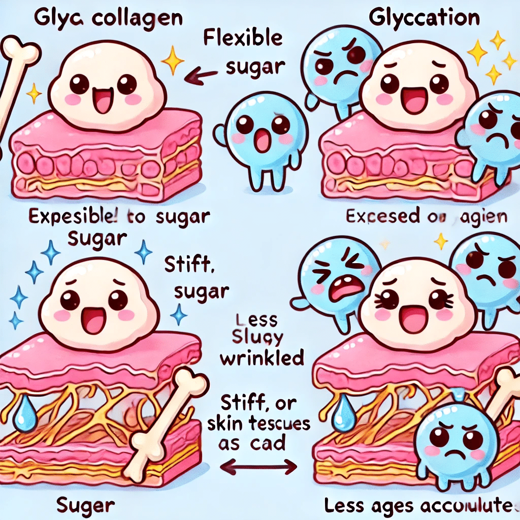 私たちの血液中に存在する糖は、エネルギー源として不可欠ですが、一定の範囲を超えて増え続けると、タンパク質と結びつきやすくなり、老化物質であるAGEs(終末糖化産物)を増やす原因に変わります。