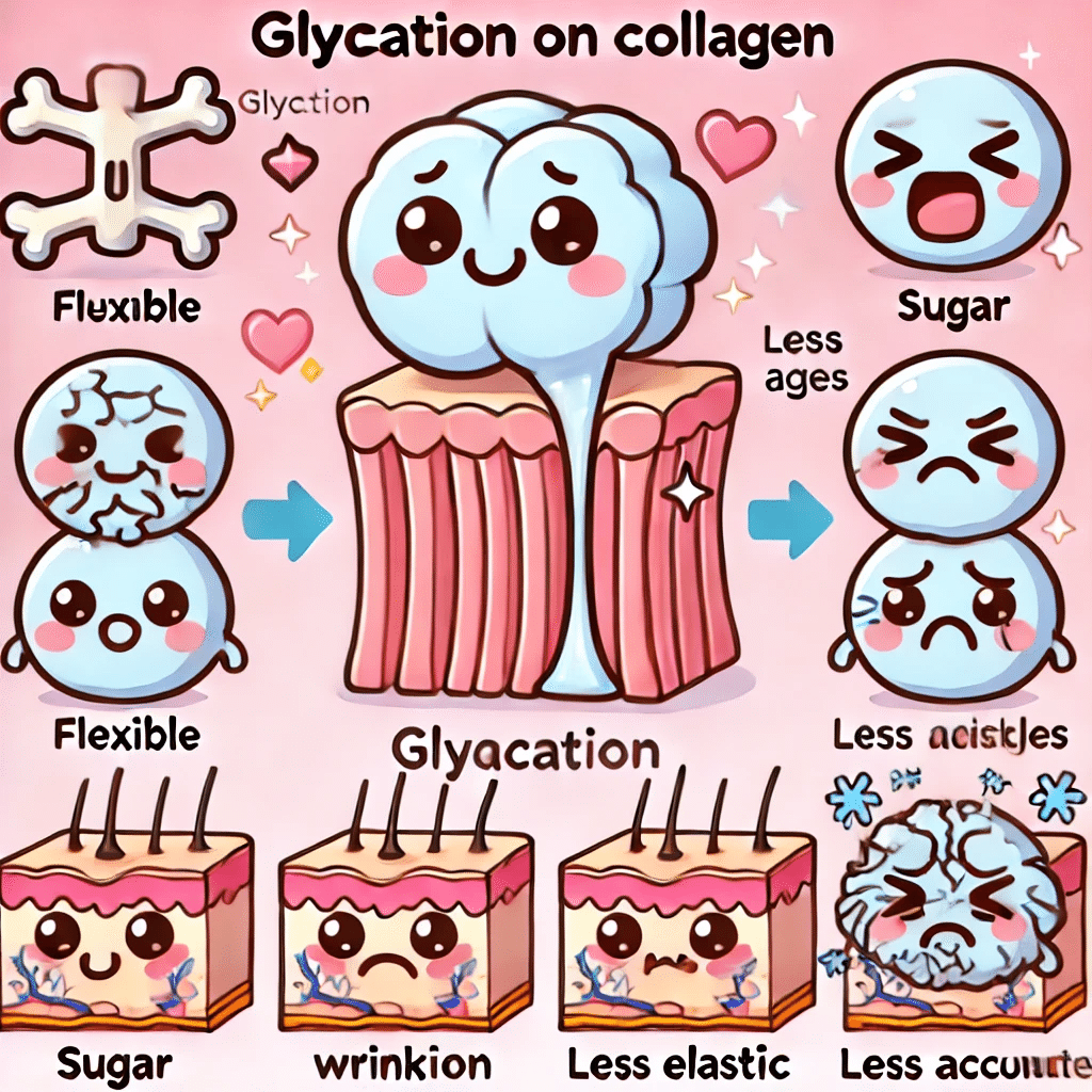 骨や肌を支えるコラーゲンも糖化に弱く、劣化すると弾力を失い機能低下を招きます。