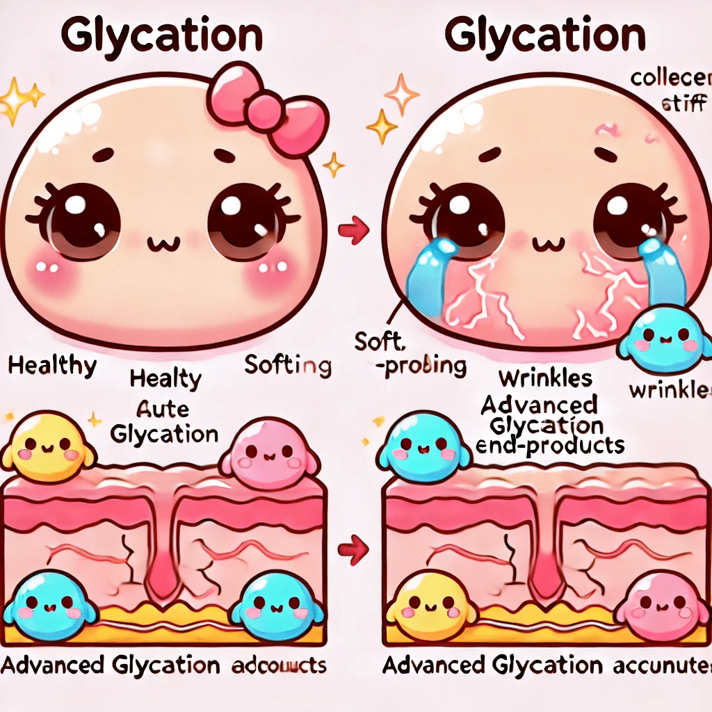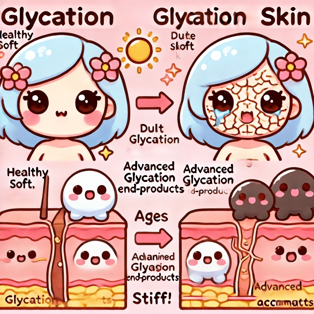 骨と同じように、私たちの肌もコラーゲンが豊富に含まれ、コラーゲンは肌のハリや弾力、水分保持を支える重要なタンパク質ですが、糖化の影響を受けやすいという特徴があります。