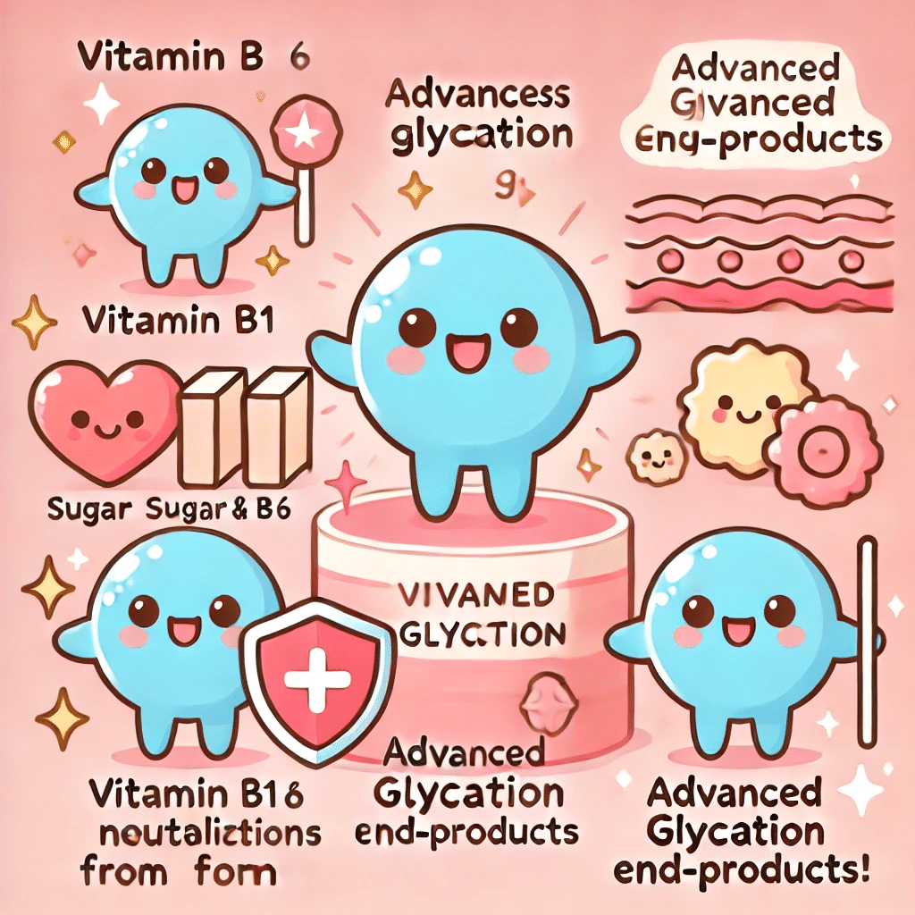 ビタミンB6は、体内でタンパク質と糖が結びつくのを阻害する働きを持ち、糖化そのものを抑えることができる重要な栄養素なのです。