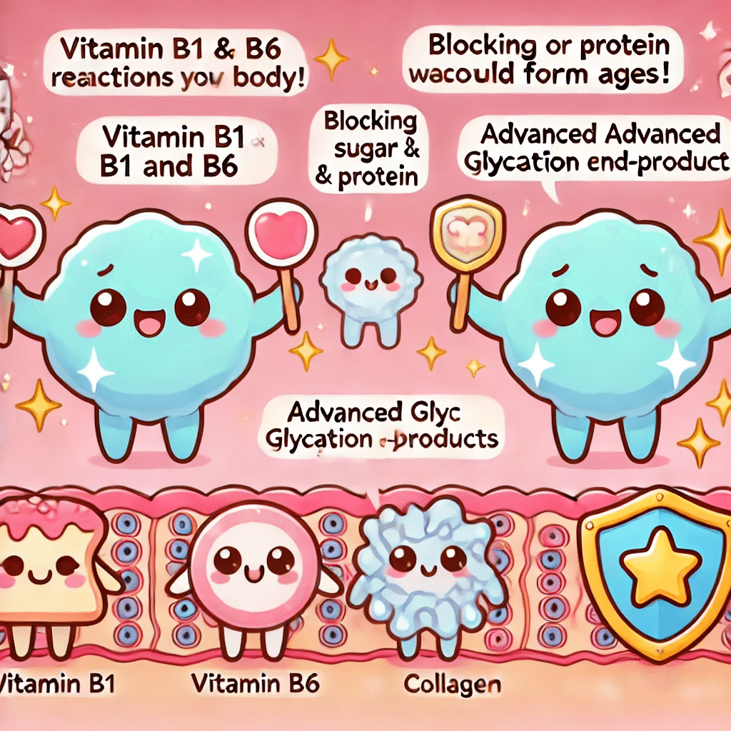 例えば、ビタミンB1は糖質の代謝を助け、血糖値の急上昇を抑える役割を果たし、ビタミンB2やナイアシンも細胞のエネルギー産生をスムーズに進め、糖化の原因となる余剰な糖をため込まないように働くのです。
