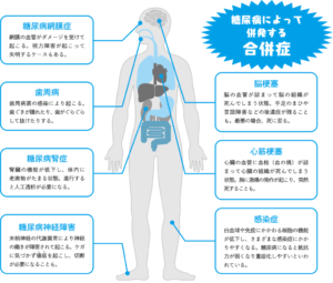 高血糖によって血管や神経に障害が起こり、心筋梗塞や脳卒中、腎臓病や失明など、全身に重大な影響を及ぼす病気です。