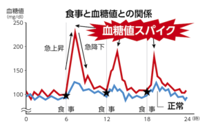 この急上昇を「血糖値スパイク」と呼び、繰り返されることで血管の内側を傷つけ、動脈硬化のリスクを高める原因となり、糖尿病や心筋梗塞、脳梗塞などの生活習慣病とも深く関係しています。