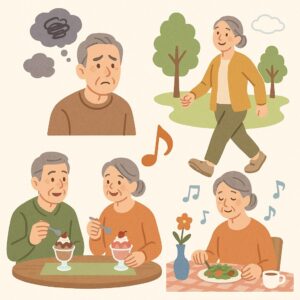 さらに、食事の時間を楽しむ工夫も必要になり、お気に入りの器やランチョンマットを使う、音楽を流すなど、演出を変えるだけで気分が和らぎ、心身の安定につながります。