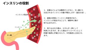 インスリンは膵臓(すいぞう)から分泌され、血液中のブドウ糖を細胞に取り込ませる働きをします。