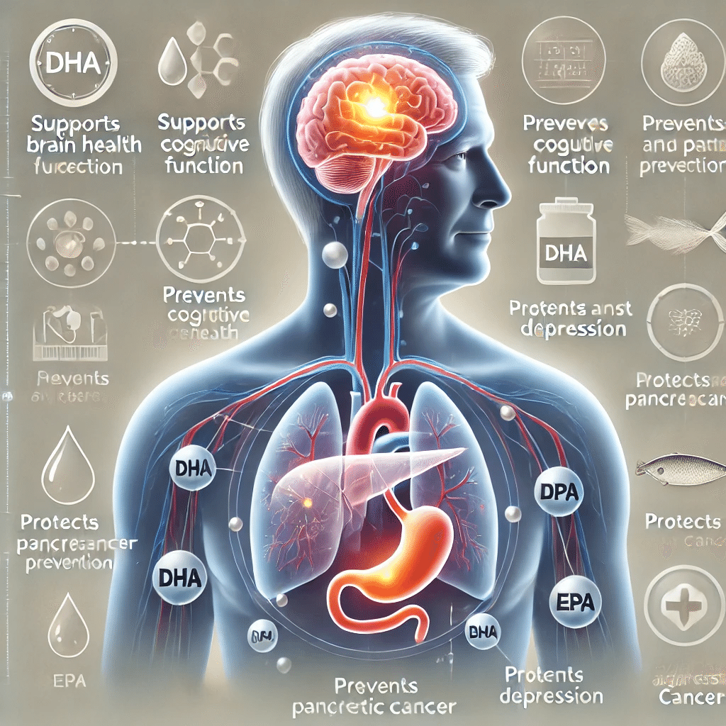 加えて、DHAは脳の神経細胞の膜に多く存在し、脳の働きを高め、認知機能の維持やうつ病予防にも効果が期待され、魚介類を食べることは、膵臓がんの予防に限らず、心と体の幅広い健康を支える鍵になります。
