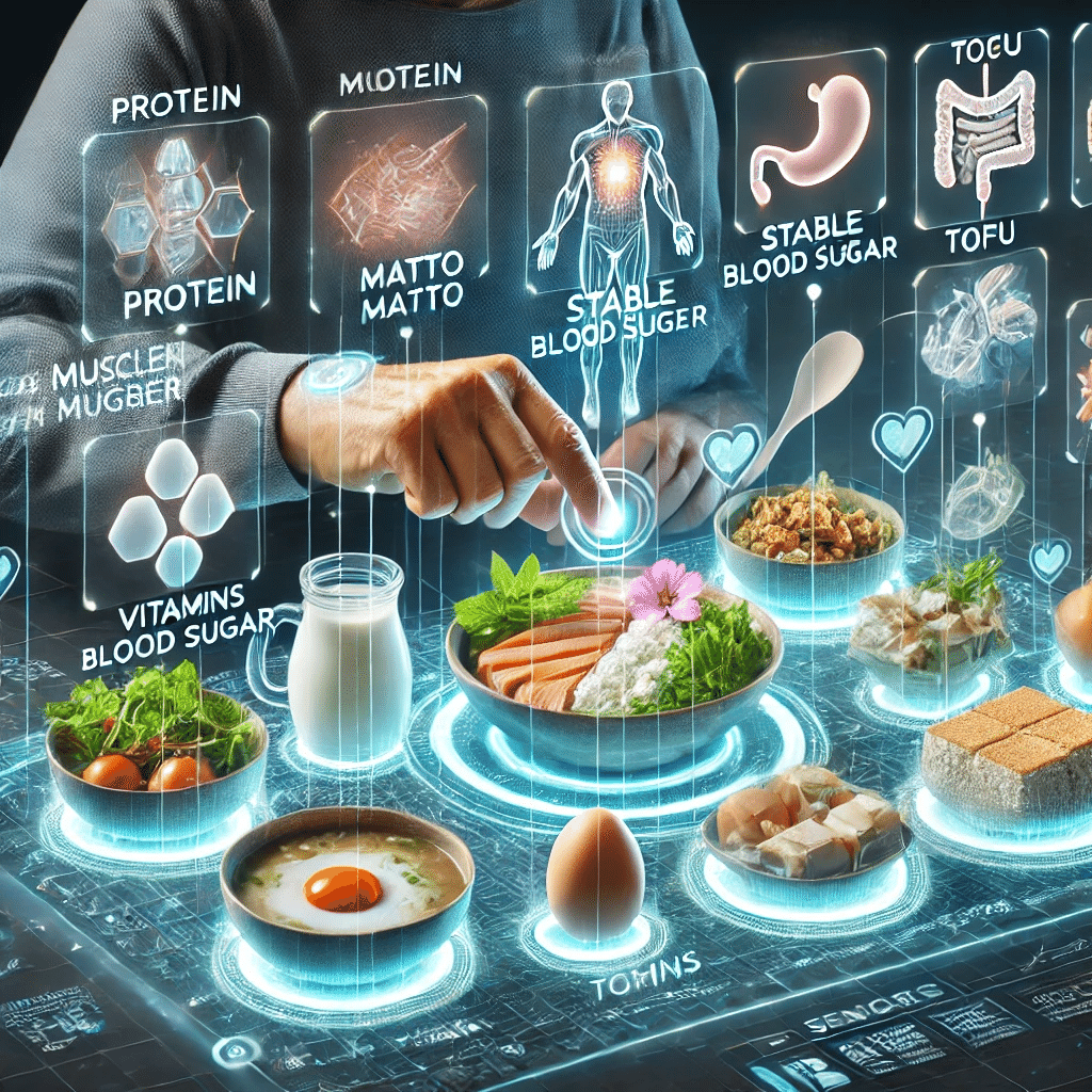 たとえば、納豆や卵、ヨーグルト、豆腐などのたんぱく質を含む食品をプラスすることで、血糖値の安定や筋肉を維持し、味噌汁や野菜を取り入れることで、ビタミンやミネラル、食物繊維もしっかり補うことができます。