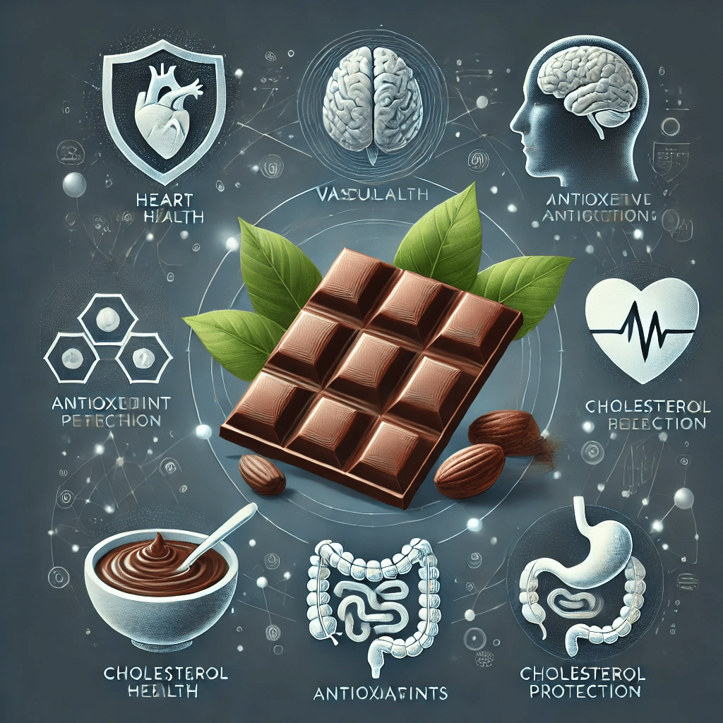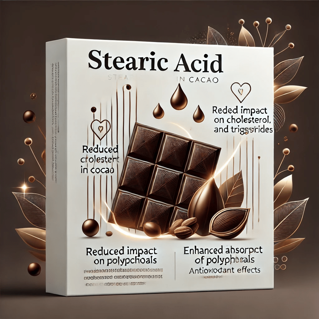 カカオに含まれる脂肪の多くはステアリン酸という種類で、これは体内で吸収されにくく、中性脂肪やコレステロールの増加にほとんど影響を与えません。