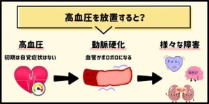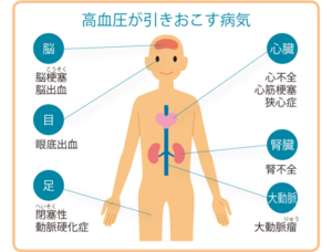 高血圧は血管に大きな負担をかけ、最終的には動脈硬化や心筋梗塞、脳卒中などの命を脅かす深刻な病気を引き起こす原因となります。