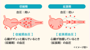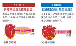 通常、血圧は上(収縮期血圧)と下(拡張期血圧)の2つの数値で示され、上の血圧は心臓が収縮して血液を送り出す際の圧力、下の血圧は心臓が拡張して血液を受け入れる際の圧力を表し、健康な血圧は通常、120/80mmHg以下とされています。