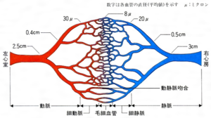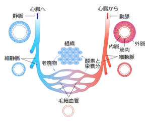 毛細血管は、動脈と静脈を繋ぐ細い血管で、細胞に酸素や栄養素を供給し、二酸化炭素や老廃物を回収します。