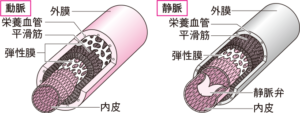 一方、静脈は全身の細胞から血液を集めて心臓に戻す役割を担い、静脈には弁があり、血液が逆流しないようにしていますが、動脈に比べて圧力は低いです。