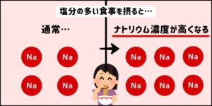 食事で塩分を摂り過ぎると、血液中の塩分濃度が上がり、体の水分が保持されるため、血液量が増加し、血液量が血管に圧力をかけ、血圧が上昇する原因となります。