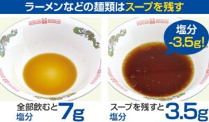 麺類のスープや汁には、塩分が多く含まれていることが多く、ラーメンやうどんなどのスープは、塩分が濃いので汁を飲み干すことを習慣にしていると、知らず知らずのうちに大量の塩分を摂取してしまいます。