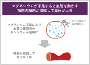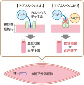 マグネシウムは動脈を拡げる働きがあり、血流をスムーズに保つためのミネラル、マグネシウムが不足すると、血管が収縮し、血圧が上昇する原因になります。