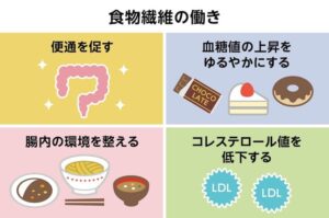 不溶性食物繊維は腸内で水分を吸収し、便のかさを増して便通を促進するため、腸内環境を整え、血圧の管理をサポート、食物繊維を豊富に含む食品を積極的に取り入れることで、健康的な血圧を維持しましょう。
