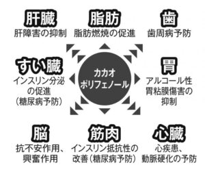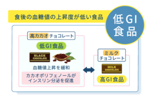 カカオに含まれるフラバノールやポリフェノールは、血糖値の上昇を抑制し、インスリンの分泌を助ける働きがあります。