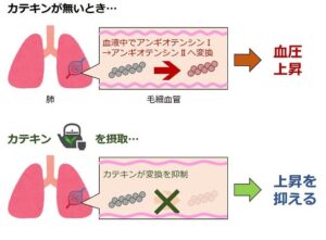 カテキンは、糖質の吸収を抑制し、血糖値の急激な上昇を防ぐため、血圧への負担を軽減し、血糖値が安定することで、血圧の急激な変動を防ぎ血圧を安定させることができます。