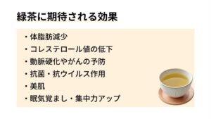 緑茶を定期的に摂取することで、カテキンが脂肪燃焼を助け、肥満を予防し、血圧の上昇を抑制することが期待できます。