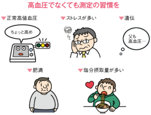 高血圧を予防・改善するためには、塩分、肥満、喫煙、ストレスなどの要因を意識的に見直していき、塩分の摂取は血圧に直接影響を与えるため、過剰な塩分摂取を控えることが推奨されます。