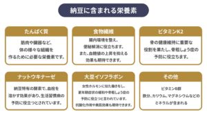 納豆に含まれるナットウキナーゼは、血栓を溶かし、血液をサラサラに保つ効果があります。