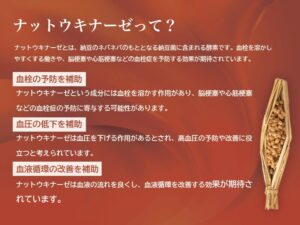 この成分は血管内の血栓を分解し、血流を改善するため、心臓病や脳卒中のリスクを減らすことができ、納豆にお酢を加えることで、さらに血液がサラサラになり、血圧の安定にも寄与します。