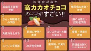 高カカオチョコレートは、カカオ含有量が70%以上のものを指し、健康に良いとされる成分が豊富に含まれ、特に糖尿病や脂質異常症の予防、さらには改善に効果的だとされています。