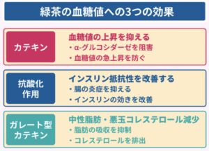 カテキンの効果には、糖質吸収の抑制や血糖値の上昇を抑える働きもあり、糖質を摂取すると、血糖値が急激に上昇し、その後インスリンが分泌されて血糖値を下げますが、このプロセスで血圧も影響を受けることがあります。