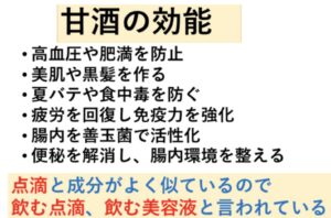 甘酒は「飲む点滴」とも呼ばれる栄養豊富な飲み物で、特に米麹甘酒に含まれるアミノ酸が血圧を上げる酵素を抑制する働きがあります。