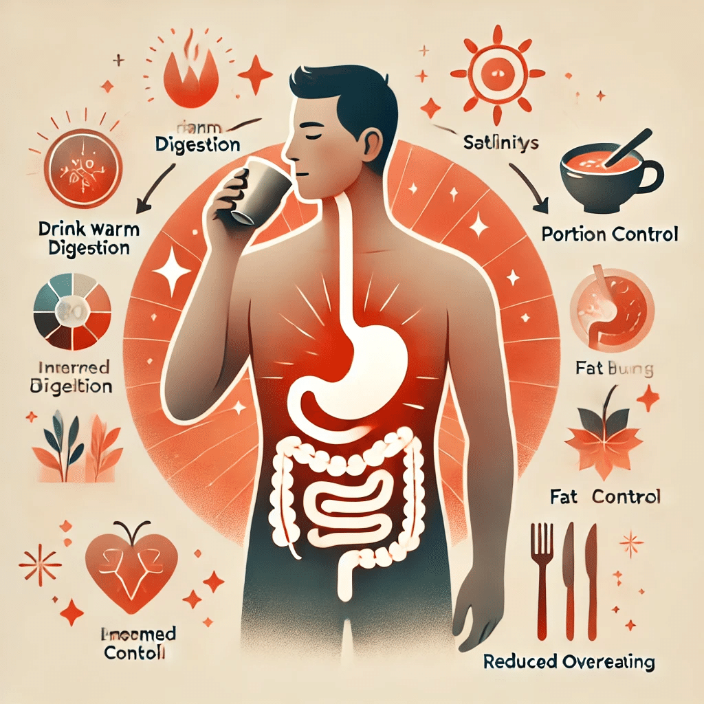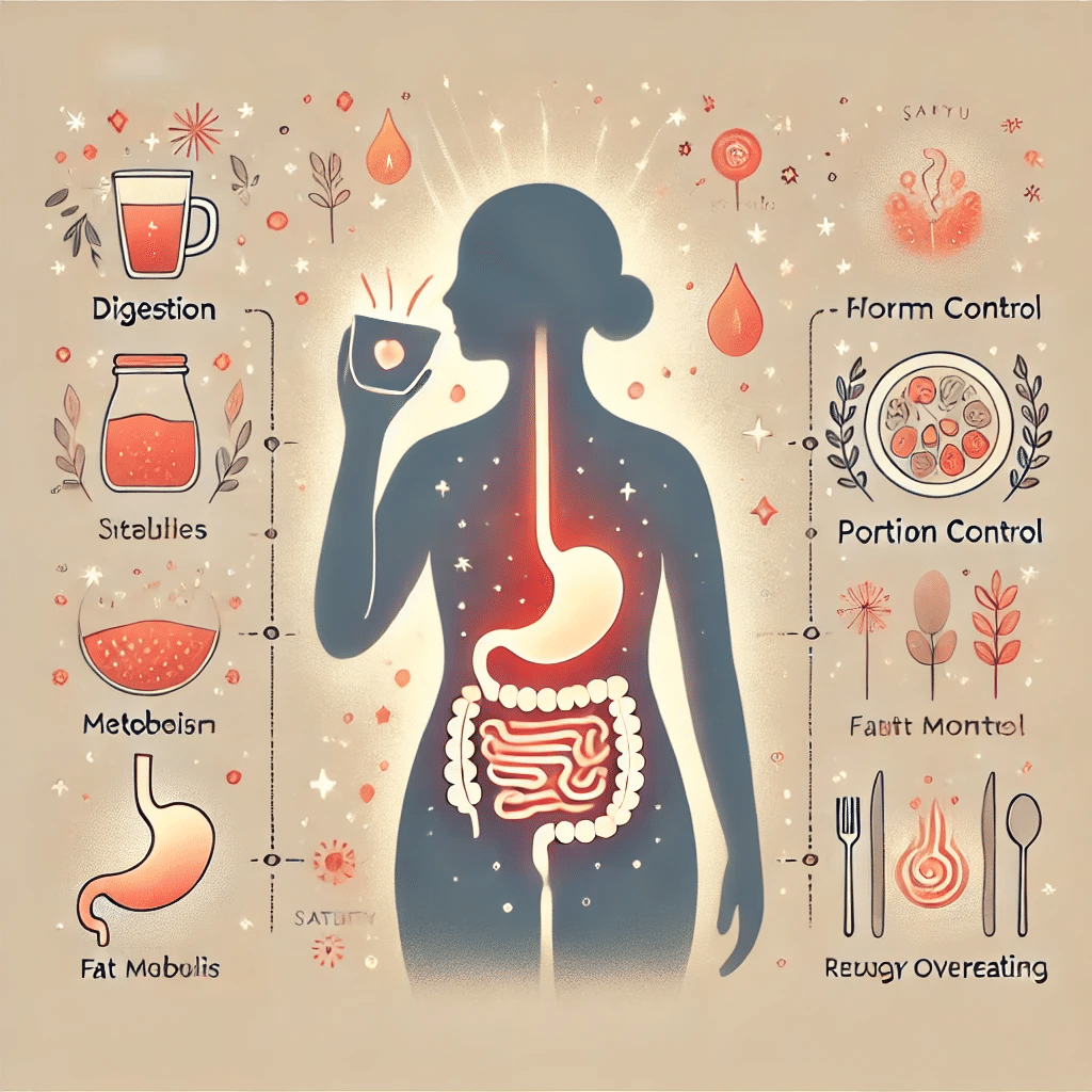 これにより胃腸が温まり、これから入ってくる食事をより効率的に消化・吸収できる準備が整い、温かい白湯を飲むことで、満足感が生まれ、食べ過ぎを防ぐ効果も期待できます。