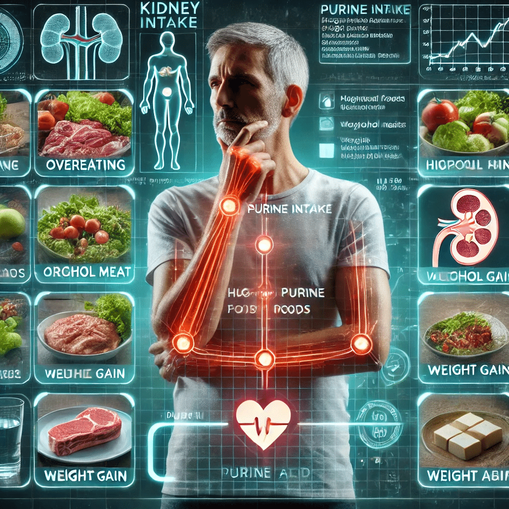 この内臓脂肪肥満は、高尿酸血症や痛風のリスクを大きく高め、内臓脂肪が増えると、インスリン抵抗性が悪化し、腎臓での尿酸排泄が妨げられます。