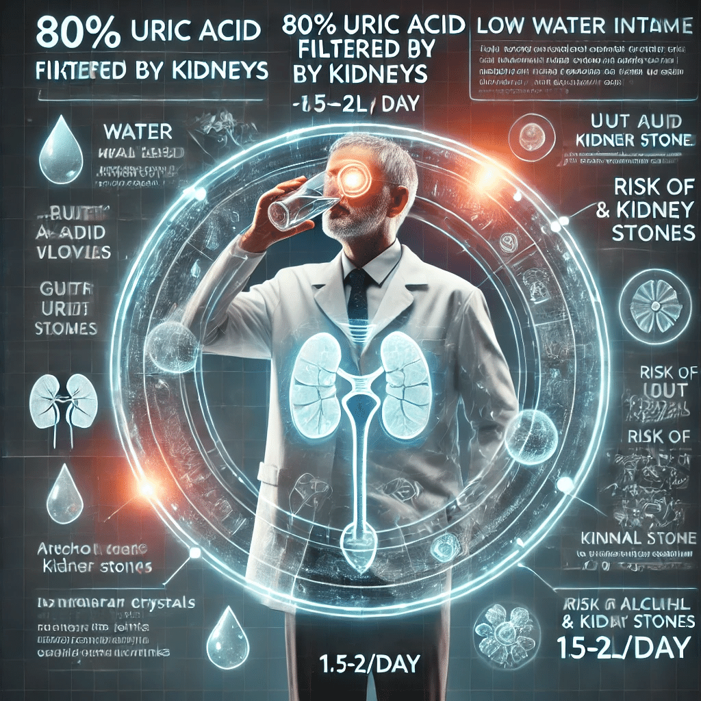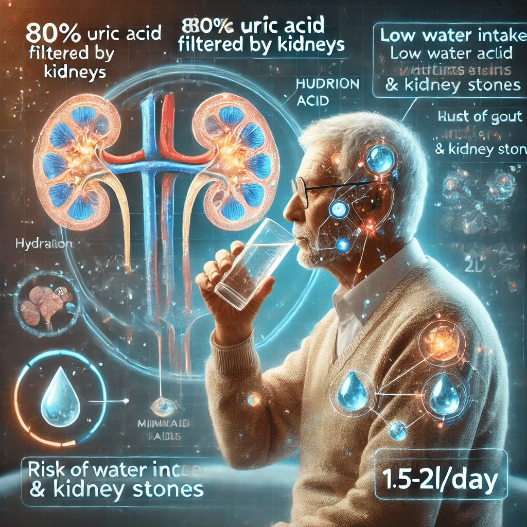 尿酸の約80%は腎臓で濾過され尿として排泄されますが、水分摂取量が不足すると尿の量が減り、尿酸が体内に滞りやすくなり、これにより血中尿酸値が上昇し、尿酸結晶が関節や腎臓に沈着して痛風や尿路結石を招くリスクが高まります。