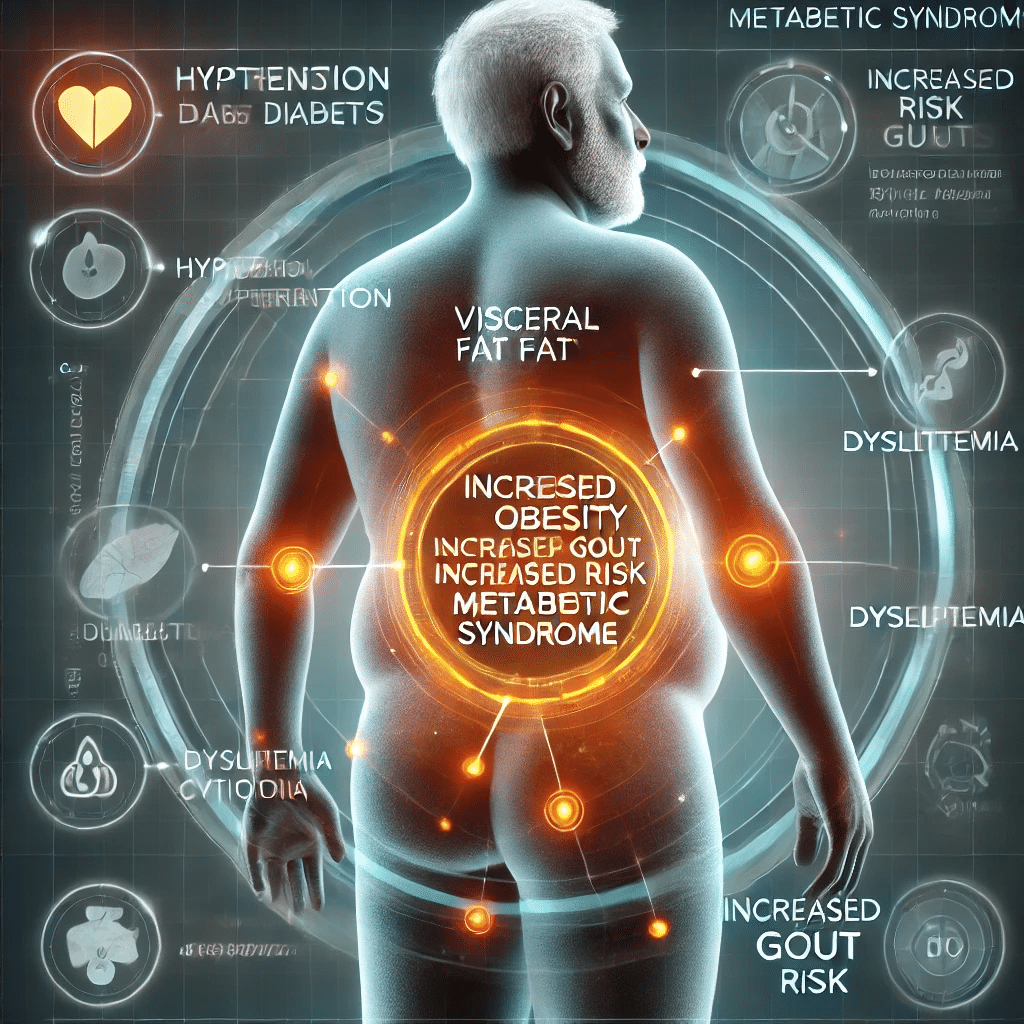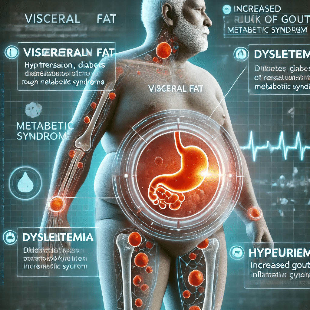 内臓脂肪肥満はまた、高血圧、糖尿病、脂質異常症といった生活習慣病と密接に関連し、これらはすべて痛風の発症リスク因子でもあり、複数が重なることでリスクはさらに増大します。