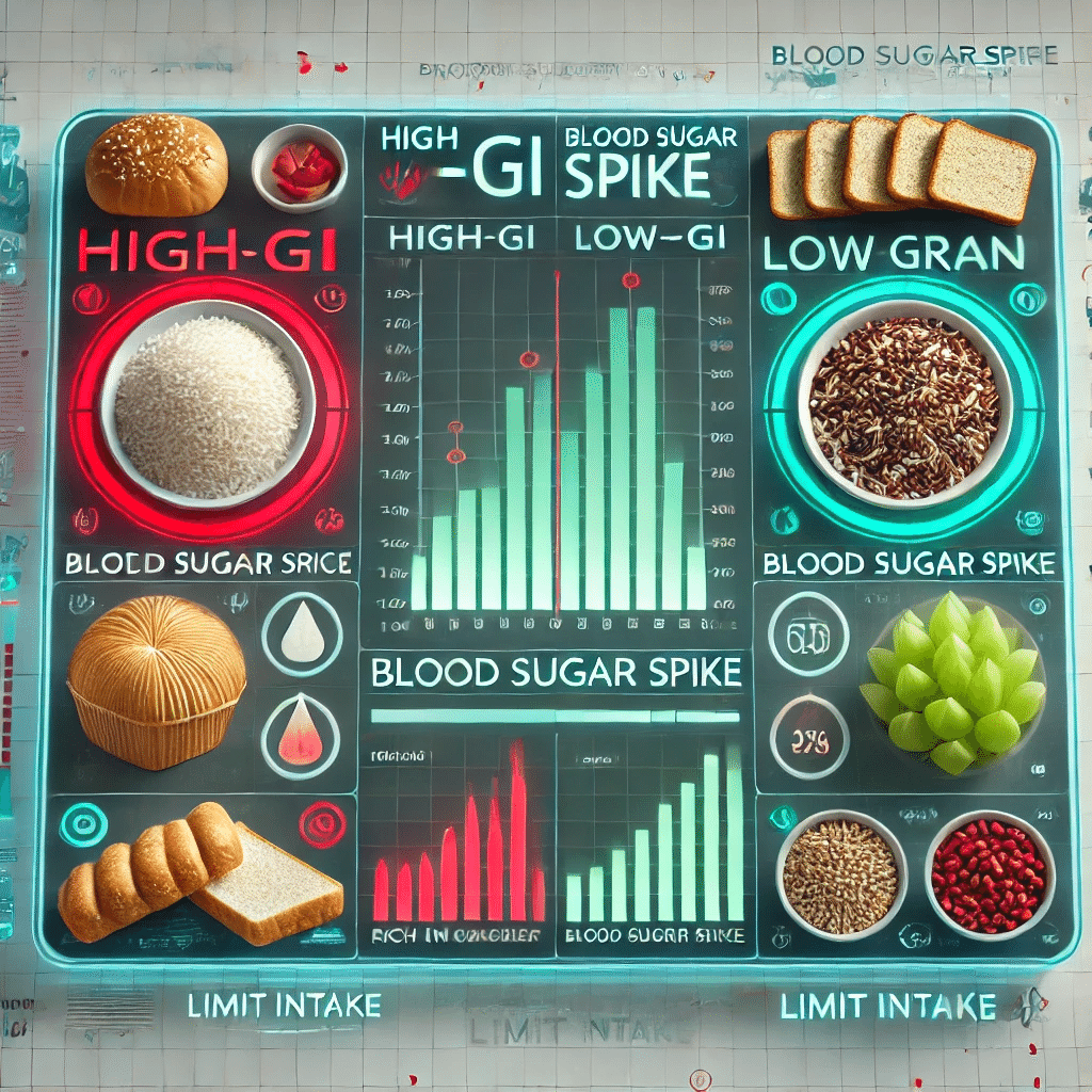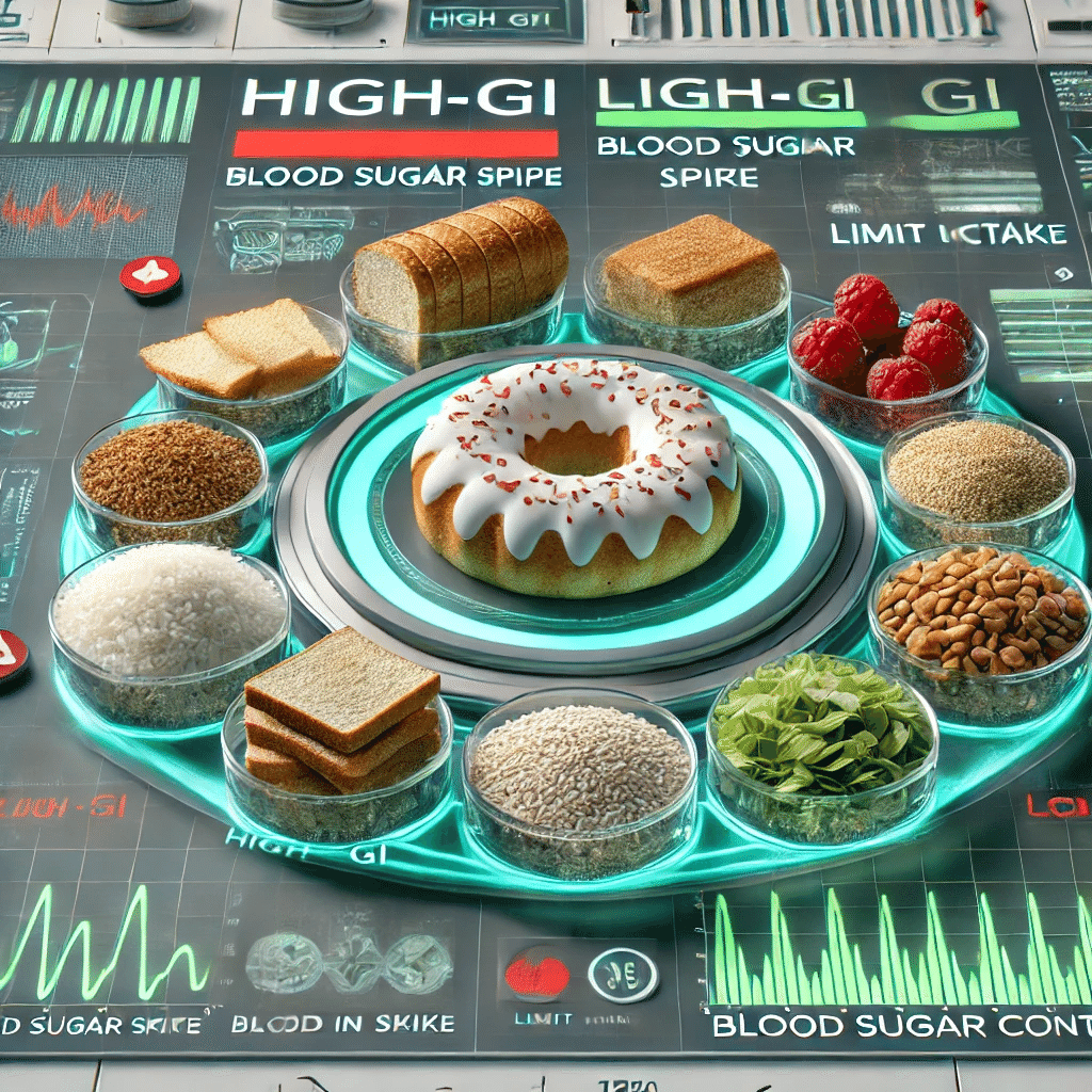 特に精製された白米や白パンなど、血糖値を急激に上げやすい「高GI食品」は、控えめにしていき、食物繊維を多く含む玄米や全粒パン、低GIのそばや雑穀などを取り入れると良いでしょう。