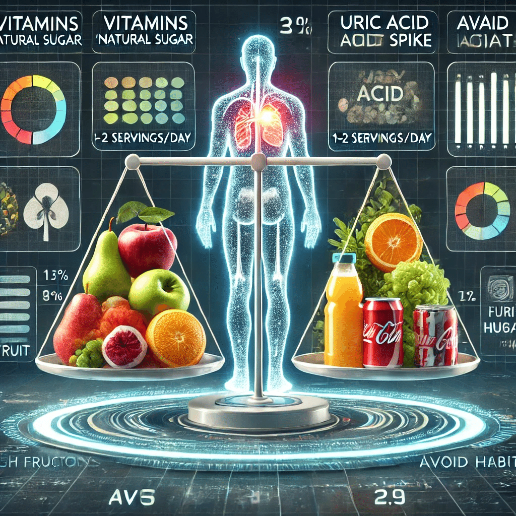 果糖(フルクトース)は、果物や蜂蜜、砂糖(ショ糖)の半分を構成する糖質の一種で、体内に入ると肝臓で代謝され、代謝過程でATP(エネルギー分子)が急速に分解され、プリン体が生成されます。