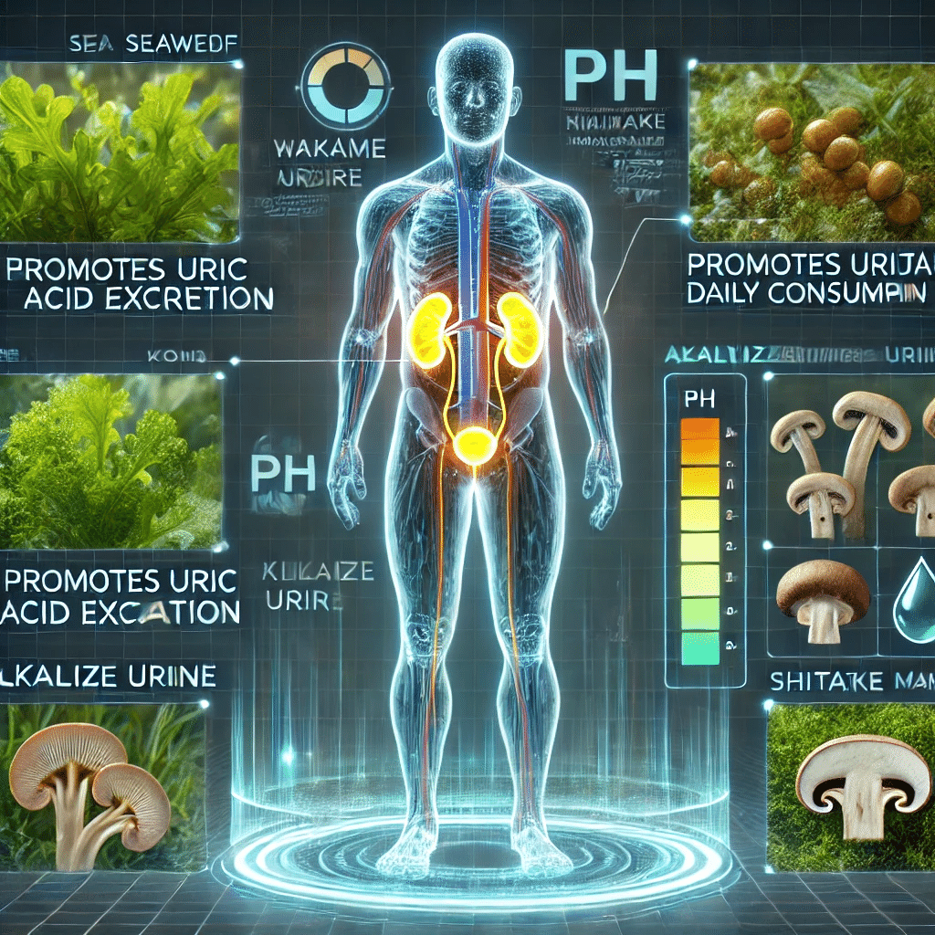 海藻やきのこ類は、緑黄色野菜と同様に尿をアルカリ性に近づけ、尿酸を溶けやすくして排出を助けます。