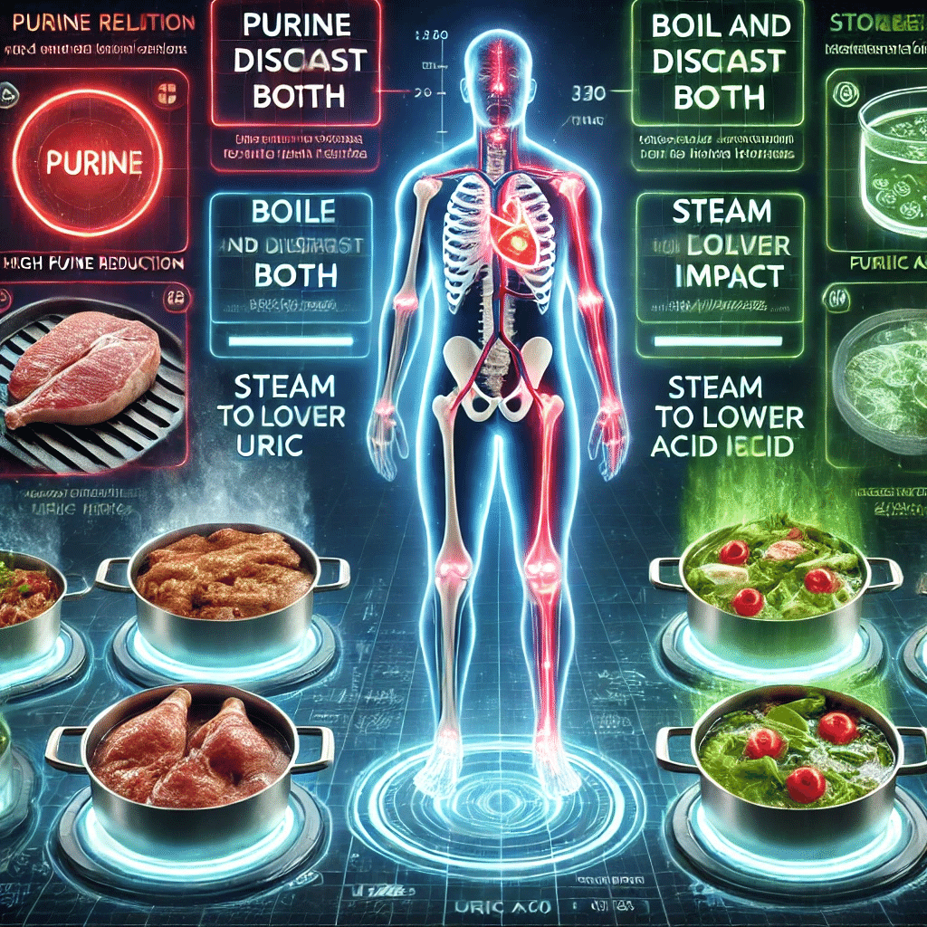 茹でる、蒸すといった方法は、プリン体を溶け出させる効果が高く、茹で汁や蒸し汁を使わないことで摂取量を抑えられます。