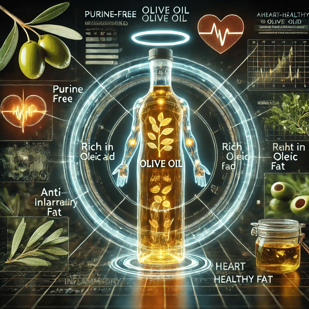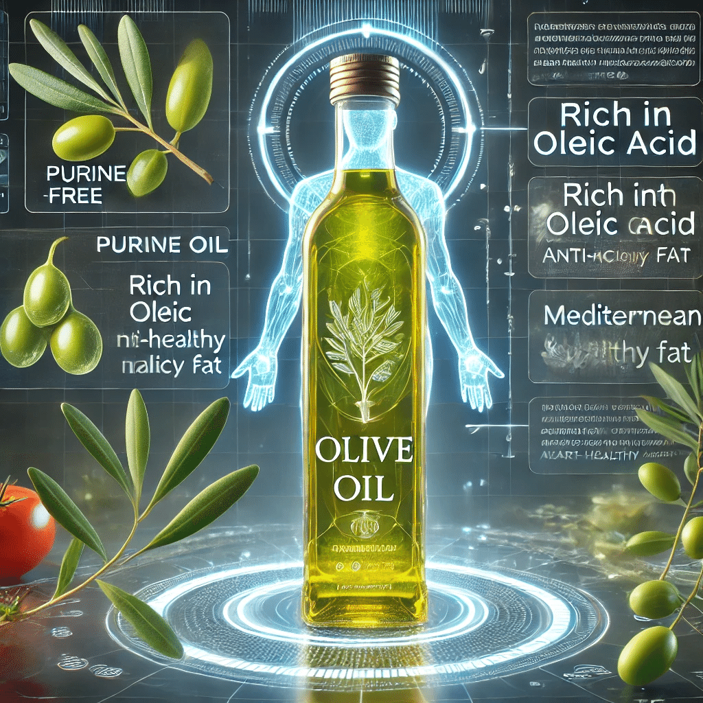 オリーブオイルは、痛風や高尿酸血症の食事改善にも役立つ調理油で、オリーブオイルにはプリン体が含まれず、さらに良質な脂質であるオレイン酸が豊富に含まれています。