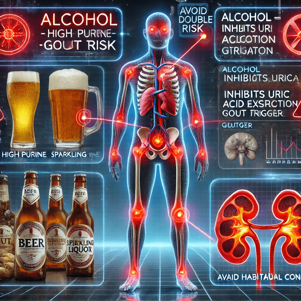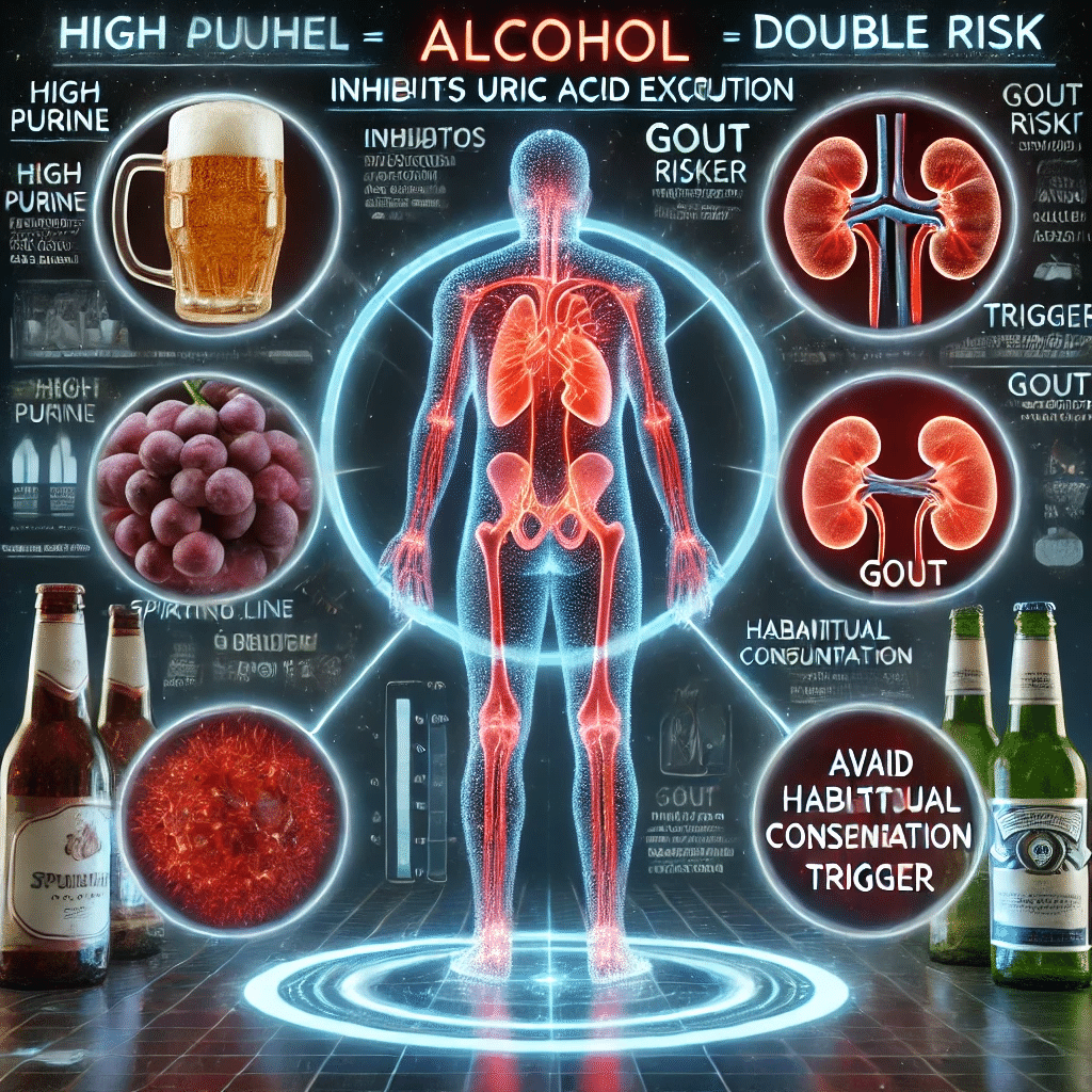 さらに、アルコールは腎臓での尿酸排泄を妨げるため、二重の意味で尿酸値を上昇させる原因となり、ビールや発泡酒はプリン体を多く含み、痛風発作の引き金になりやすいとされています。