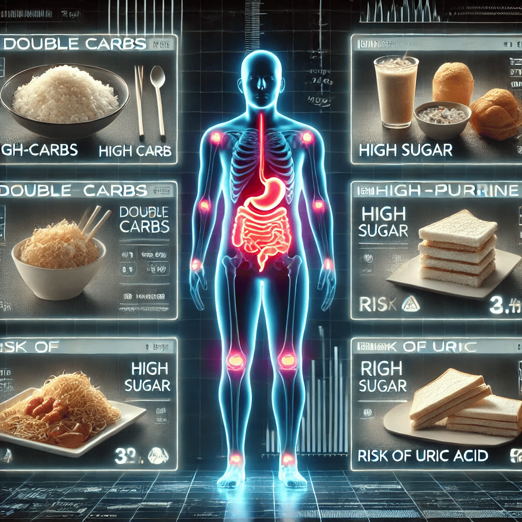 丼物やラーメン+チャーハンなどの「ダブル糖質」は、血糖値を急上昇させるだけでなく、肥満や生活習慣病、そして尿酸値の上昇にもつながります。