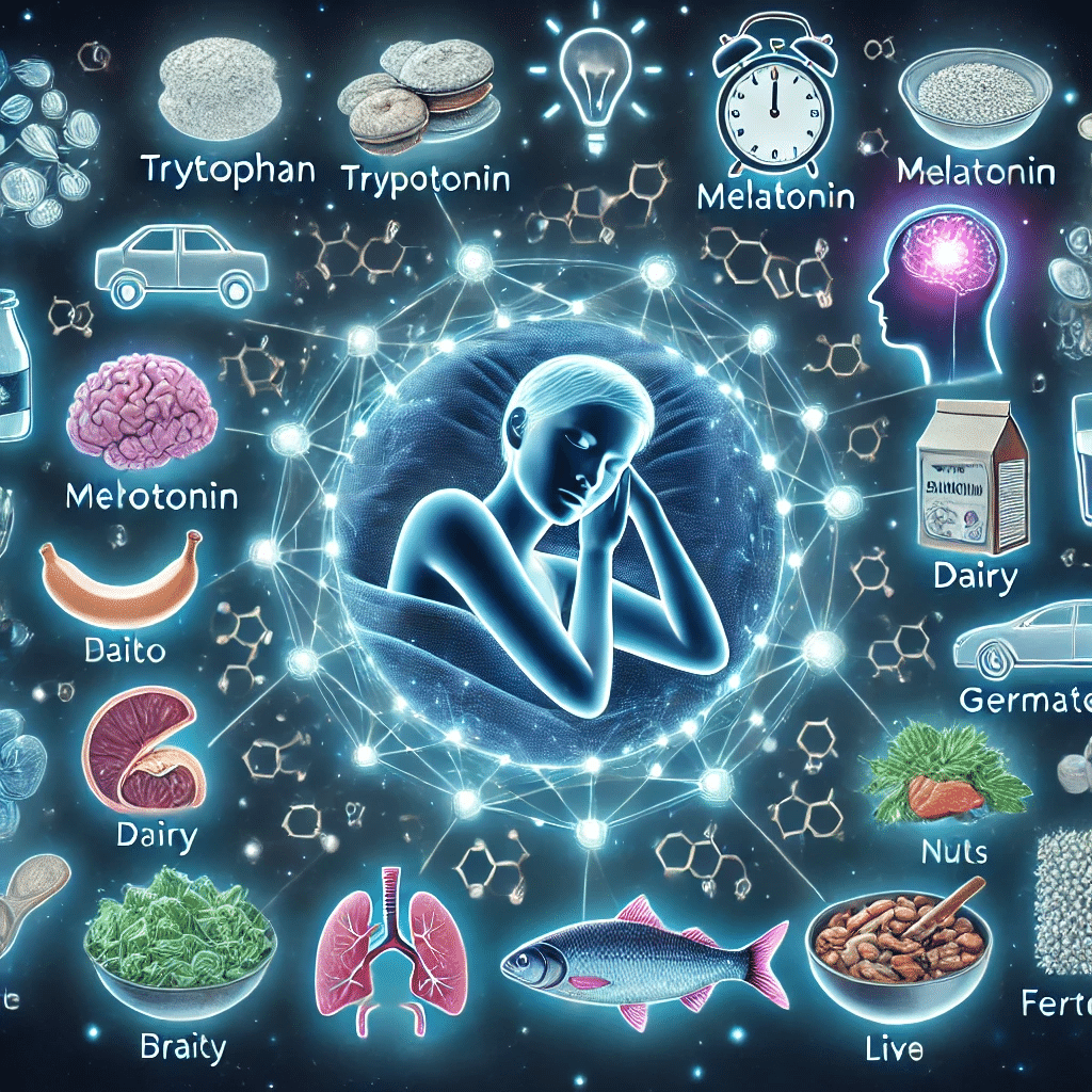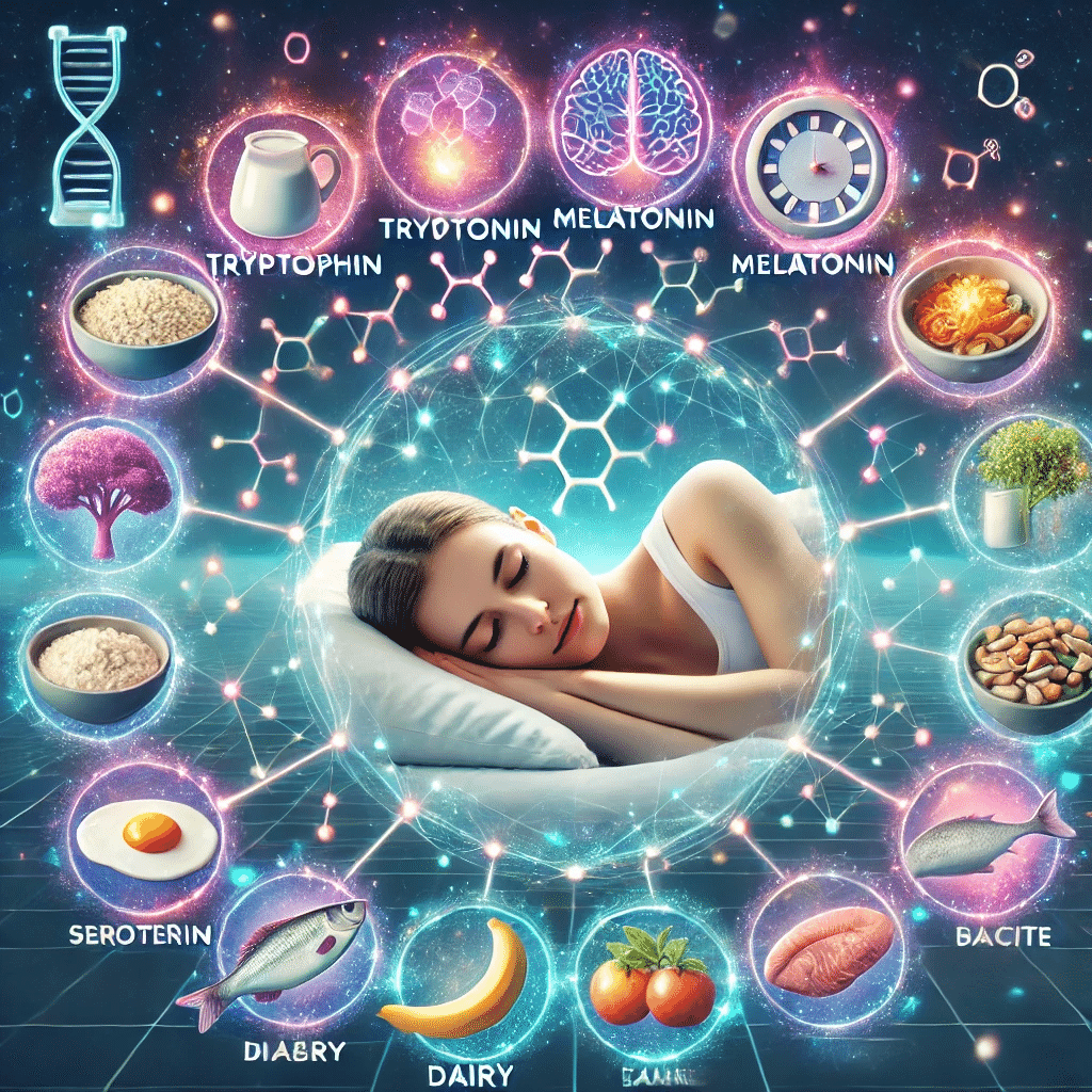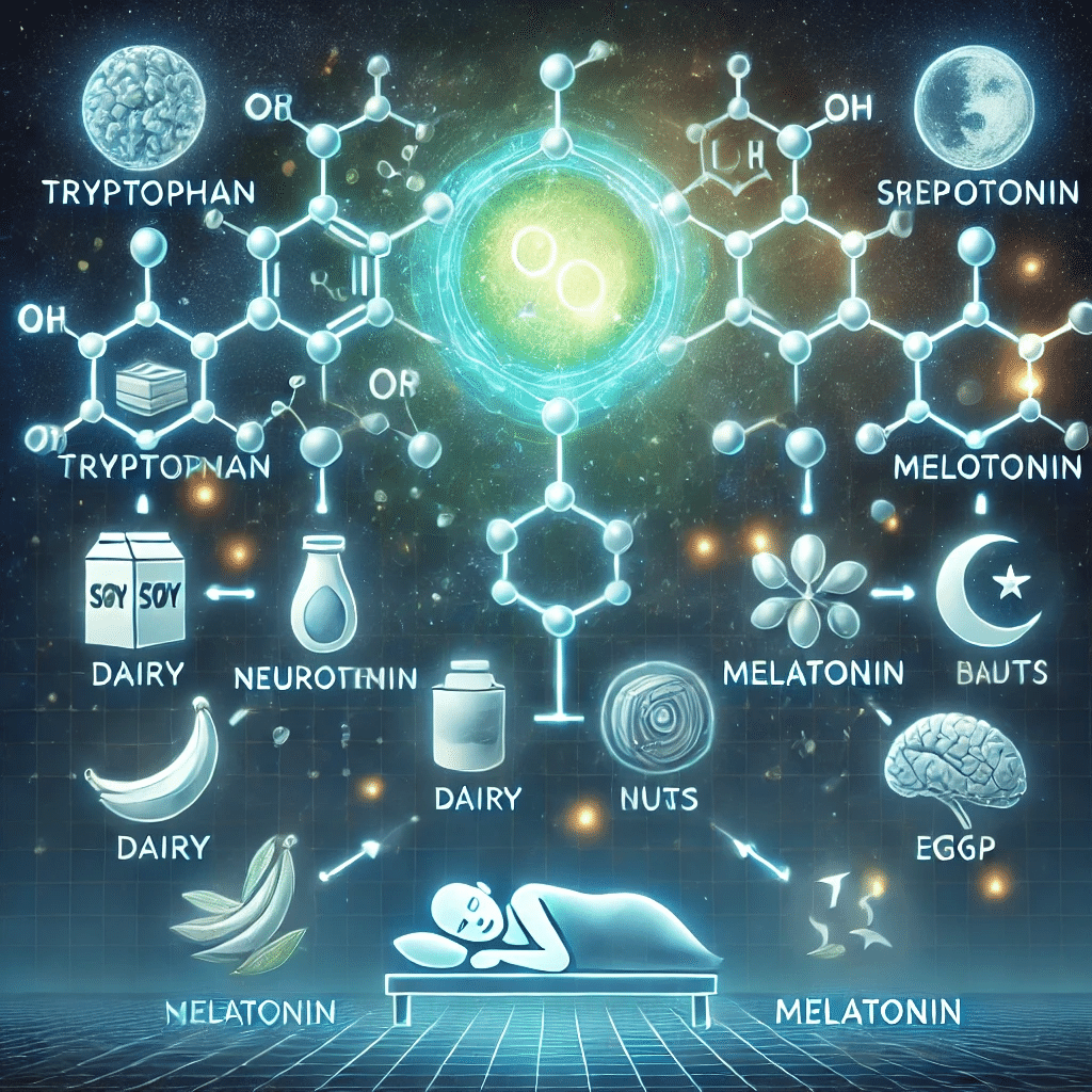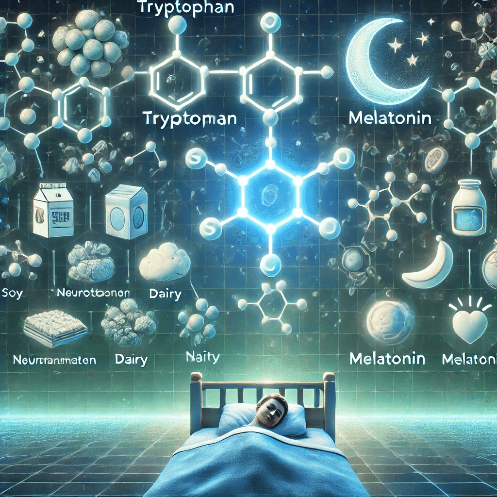 まず注目すべきは、トリプトファンというアミノ酸、トリプトファンは、体内で「セロトニン(心を落ち着けるホルモン)」や「メラトニン(眠気を促すホルモン)」に変わる原料となるため、眠りに非常に重要な栄養素です。
