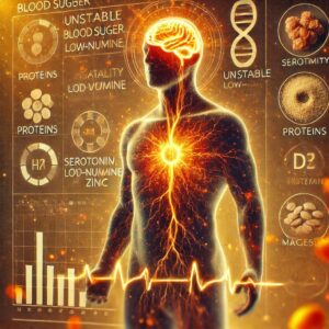 例えば、神経伝達物質の材料となるアミノ酸が不足すると、セロトニンやドーパミンといった「幸せホルモン」が十分に作られないために、気分の落ち込みや無気力感を強め、うつ病のリスクを高めてしまうのです。
