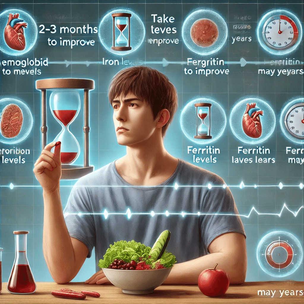 鉄分の値を解消していくためには、すぐに数値が改善することはなく、Hbの値は2〜3ヶ月、フェリチンに関しては数年かかることもあるのです。