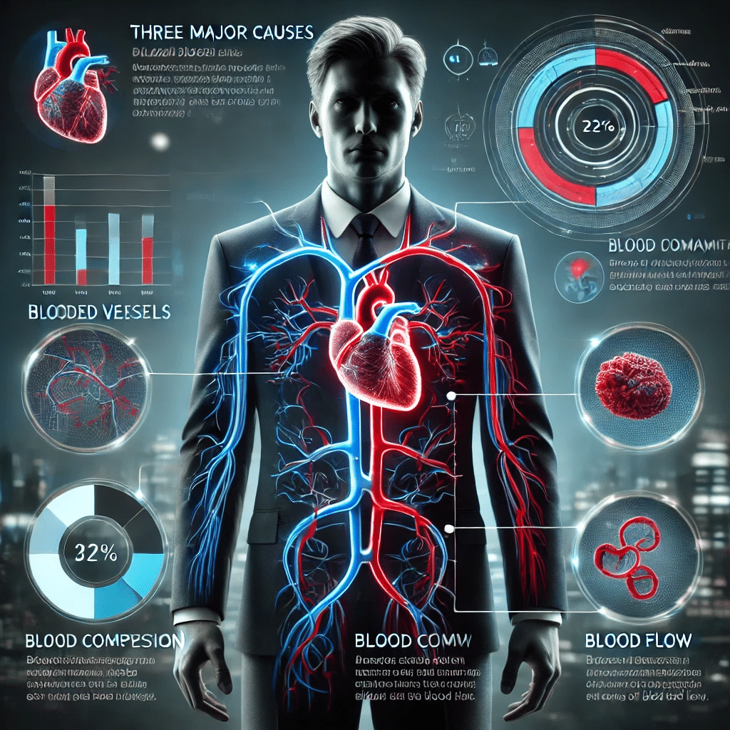 2つ目の要因は「血液の異常」、血液がドロドロしている状態では、血小板や凝固因子が過剰に働き、血栓ができやすくなります。