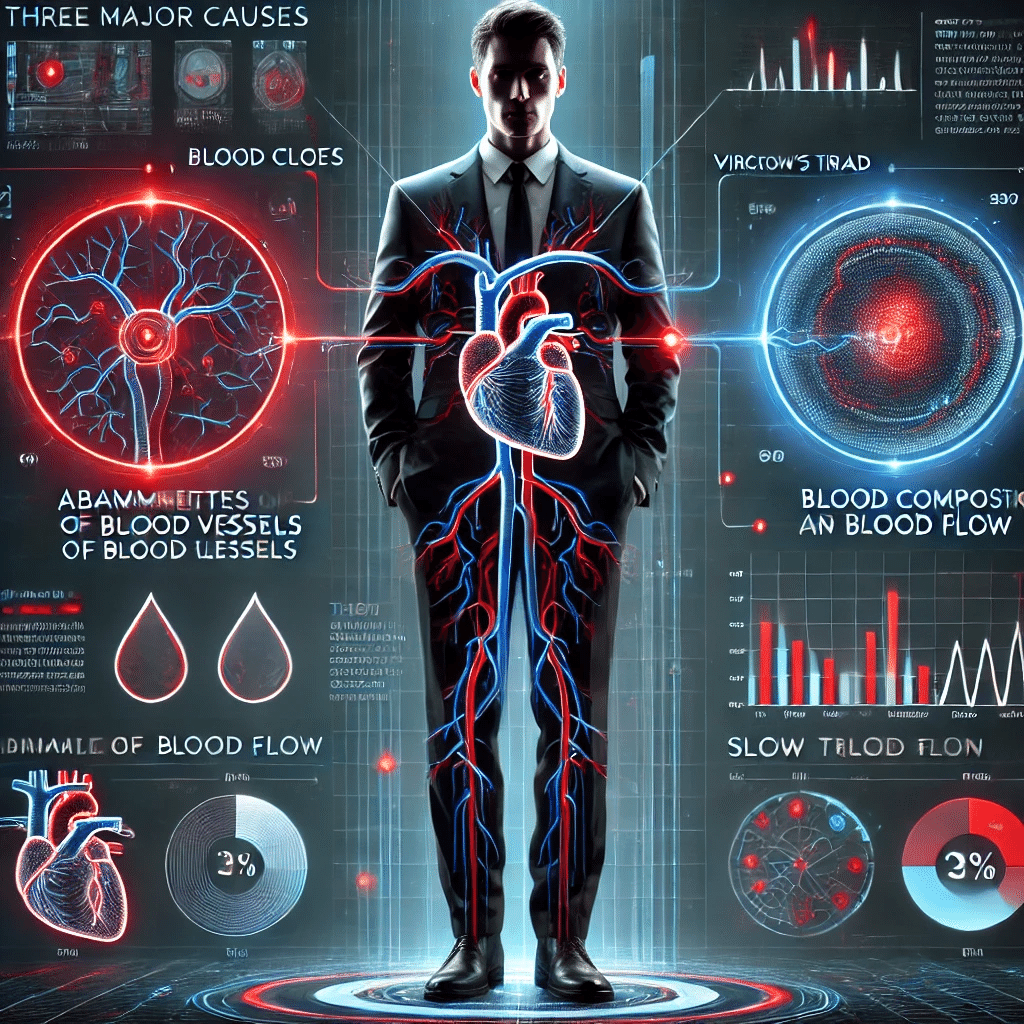 血栓を引き起こす主な原因は、「血管」「血液」「血流」、この3つの異常になり、これは「血栓三因子」とも呼ばれ、どれか一つでもバランスが崩れると、血栓リスクが高まります。