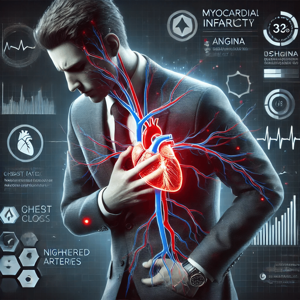 心筋梗塞の前段階にあたるのが「狭心症」、こちらは一時的に血流が悪くなる状態で、胸の痛みや圧迫感などが現れますが、血流が回復すれば症状は改善します。