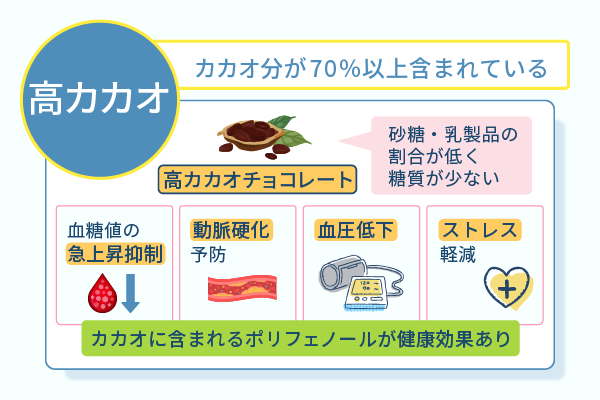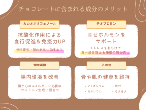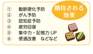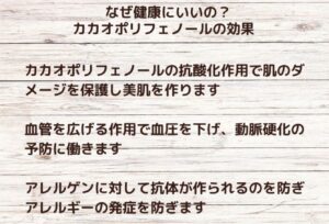 また、カカオポリフェノールにはLDL(悪玉)コレステロールの酸化を防ぐ働きがあり、動脈硬化や心血管疾患の予防にも効果的とされています。