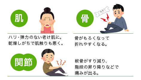これが脳で起こると、脳出血や脳梗塞といった命にかかわる病気に発展する危険もあります。また、血管だけでなく皮膚や関節、内臓の組織にも影響が出て、老化が進んだり、免疫力が低下したりすることもあります。