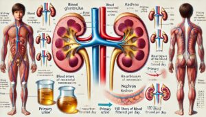 腎臓は、1日に約150リットルの血液を糸球体で濾過し、 この濾過された液体は原尿と呼ばれます。